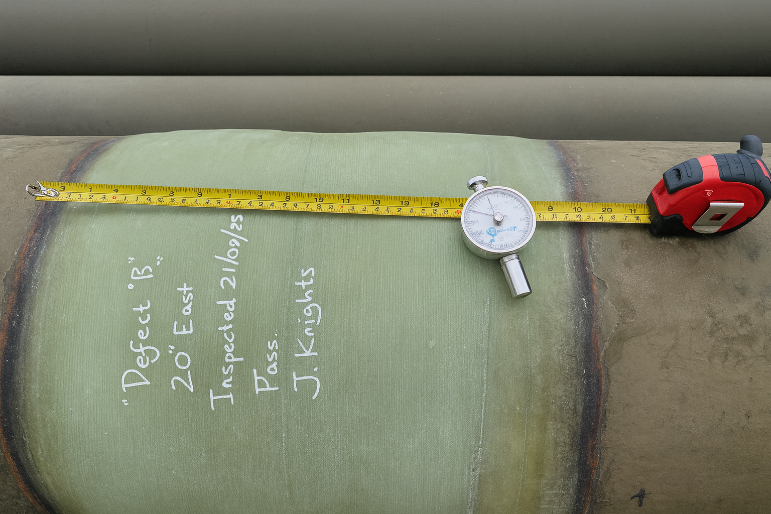 Three layers of carbon fibre composite wrap installed along the defect zone.